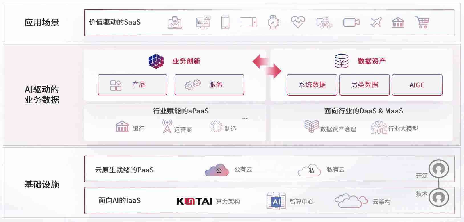 在基础设施层面,,,基于商业或开源的云原生就绪开发工具与技术组件(PaaS)和面向AI的底层公共基础设施资源(IaaS),,,,将共同支撑企业完成数字化转型